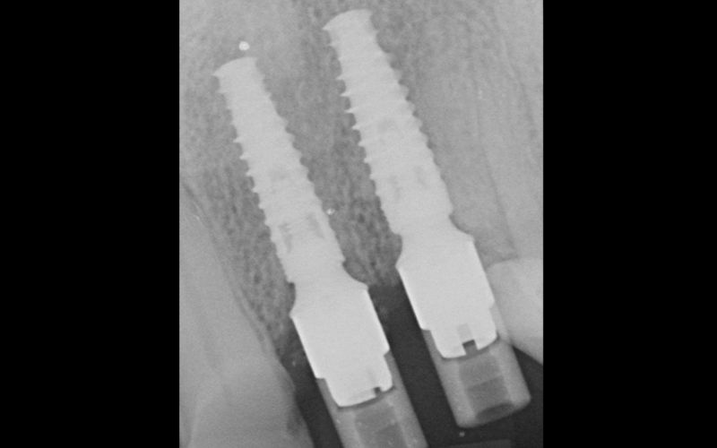 Figure 3. Postoperative radiograph of the implants with the trans-epithelial abutment, a Slim abutment in position 22, and a classic abutment in position 23, showing optimal peri-implant tissue preservation.